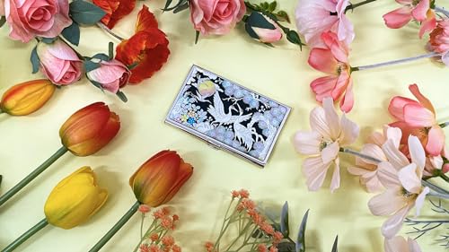 Mother of Pearl Business Card Case Credit Id Name Holder Travel Wallet Art Painting Design Metal Stainless Steel Engraved Slim Purse Pocket Cash Money Wallet (Crane) 5