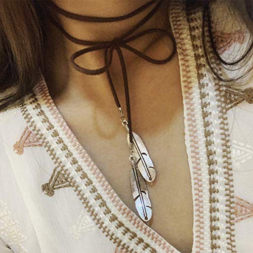 HOT ! Doubnine Boho Feather Choker Wrap Versatile Necklace Vegan Suede Lariat Gothic Brown Black Accessories for Women (brown cord + bronze feather)