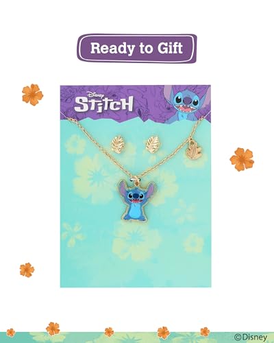 Disney Stitch Jewelry Set Official License with 16+3 Necklace and Palm Leaf Earrings, Gold Tone Fashion Necklace and Stud Earrings