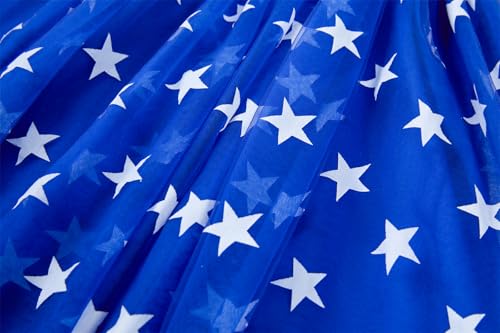 • Toddler Girls Casual Tulle Tutu Dress, with elements of the American flag. The dress is dominated by blue, red and white, with stripes and a star graphic. For a beautiful July 4th look!