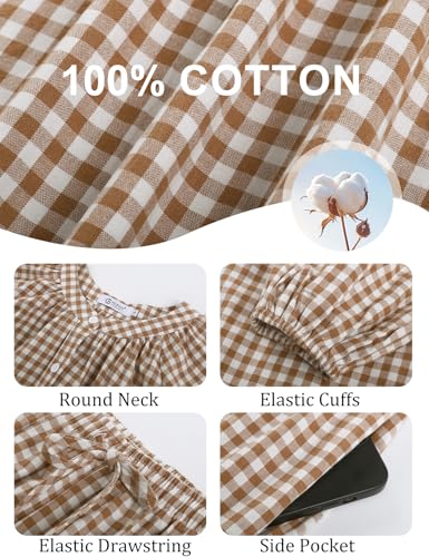 • Pajama Plaid Top: Classic women's pajama features a round neckline with button up design for easy on and off. The combination of puff sleeves and raglan sleeves not only provides freedom of movement but also enhances the design aesthetic, ensuring unrestricted comfort during sleep. The elastic cuffs on the long sleeves securely hold their position, keeping warmth in and preventing stains while eating or skincare, achieving an optimal balance of comfort, functionality, and aesthetic appeal