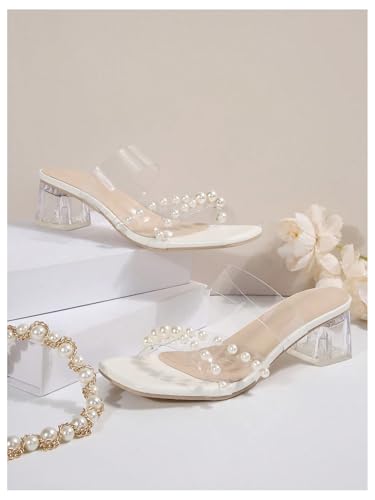 MakeMeChic Women's Pearl Clear Strap Heeled Sandals Leather Square Open Toe Chunky Sandal 5