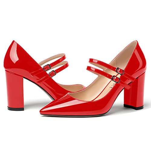 MERRORI Women's Patent Pointed Toe Block Adjustable Strap Buckle Solid Chunky High Heel Pumps Shoes 3.3 Inch