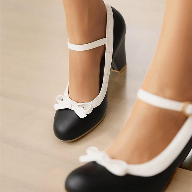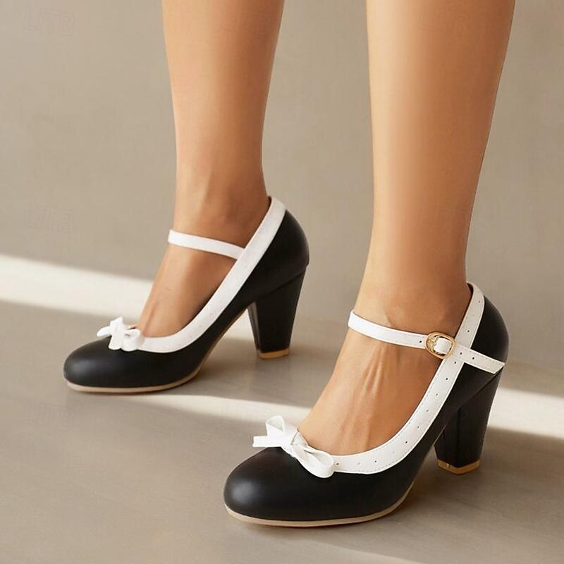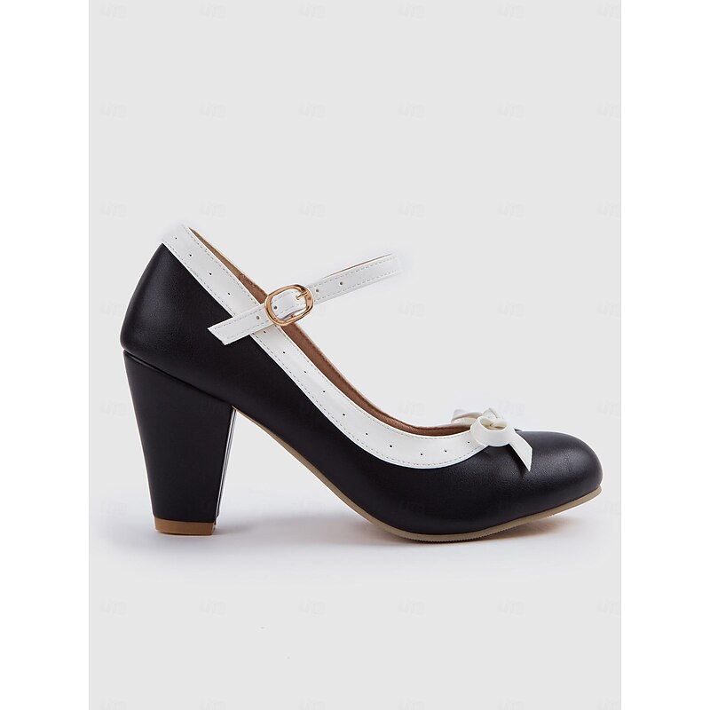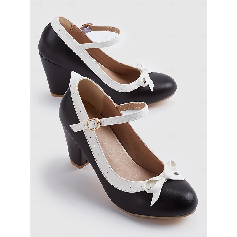 Highlights [Fabric and Material] : Crafted from premium PU upper material and synthetic leather lining, these women's Mary Jane pumps offer a durable and chic appeal. The faux leather finish ensures a smooth, polished look, perfect for elegant styling. [Design and Style] : Featuring a vintage round toe and chic two-tone color block in classic black and white, these pumps are adorned with an elegant bowknot on the front. The shoes boast a stylish cone and platform heel, providing a blend of comfort and sophistication. An adjustable ankle strap with a delicate gold buckle secures the fit. [Design Highlights] : The standout element of these pumps is the charming bow detail and the contrast of black and white, which adds a playful yet sophisticated touch. The shoes feature a moderately high and thick heel, offering a stable and comfortable elevation for various occasions. [Occasions] : Ideal for parties, daily wear, and work settings, these versatile pumps can effortlessly elevate any outfit with their elegant and classic style. They are suitable for spring, summer, and fall, catering to different seasonal fashion needs. [Size Notice] : Available in a range of sizes from US5.5 to US10.5, these pumps are designed to fit true to size. For an optimal fit, select your usual shoe size. The timeless retro design influences ensure these shoes remain a trendy choice for fashion-forward wear.