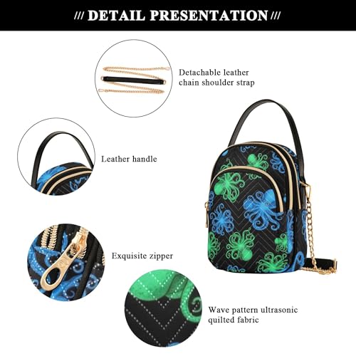 Vibrant Blue Green Octopuses Shoulder Handbags for Women Chain Wallet Cell Phone Purse Floral Print Ladies Tote Crossbody Satchel, 5.9" × 8.3" × 3.1" 3