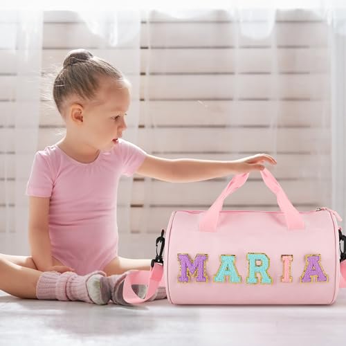 Personalized Dance Duffle Bag for Girls Dance Ballet Bag,Chenille Letter Patches Dance Bag Kids Travel Duffel Bag, Sport Duffle Bag, Cheerleader Bag, Weekender Overnight Bag Gift for Girls 7