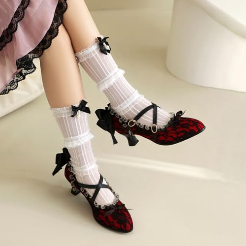 Bellirala Lace Flower Victorian Shoes for Women Vintage Kitten Heels Mary Janes Bow Pumps Mid Heeled Rockabilly Cosplay Witch Shoes 6