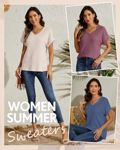 3 Pack Women Short Sleeve Sweaters 2025 Summer V Neck Tops Casual Shirts Loose Fit Lightweight Dressy Business 5