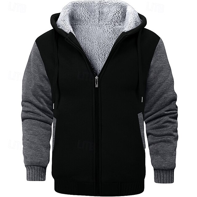: Featuring a modern color-block design, this hoodie combines a sleek body with contrasting sleeves for a stylish appearance. The hood is lined with cozy sherpa fleece, and the front zipper closure allows for easy wearing and removal. Ribbed knit bands at the cuffs and hem ensure a snug fit, keeping out the chill.