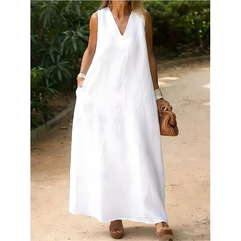 Highlights [Fabric] Crafted from a soft and breathable linen-cotton blend, this women's maxi dress ensures comfort and ease throughout the spring and summer seasons. The lightweight fabric is perfect for keeping cool and stylish in warm weather. [Fit] Featuring a regular fit, this dress flows beautifully with its maxi length design. It accentuates the figure with a classic V-neckline and sleeveless cut, offering a sophisticated yet relaxed silhouette ideal for casual outings. [Design Highlights] The dress boasts a simple yet chic aesthetic, with practical pockets that add functionality and style. Its minimalist design in a pure white hue provides a refined and timeless appeal, easily complemented by subtle accessories for an understated elegance. [Occasions] Perfect for daily wear, weekend gatherings, or a day at the beach, this versatile dress suits a variety of casual occasions. Its effortless style makes it a great choice for those seeking an elegant yet laid-back look. [Size Range] Available in sizes S, M, L, XL, and 2XL, this dress caters to a wide range of body types, ensuring the perfect fit for everyone.