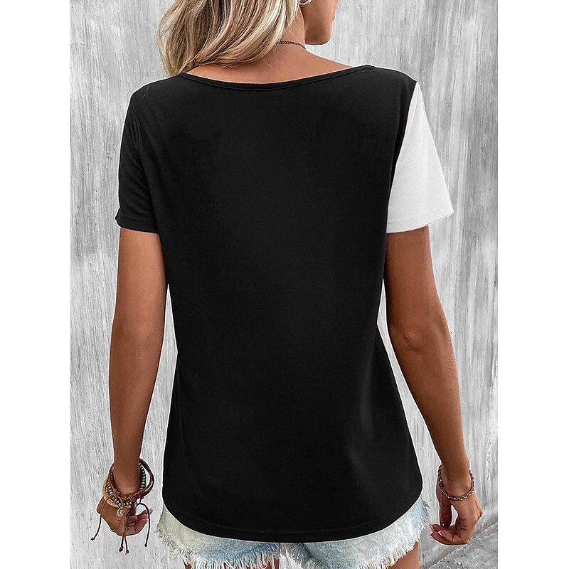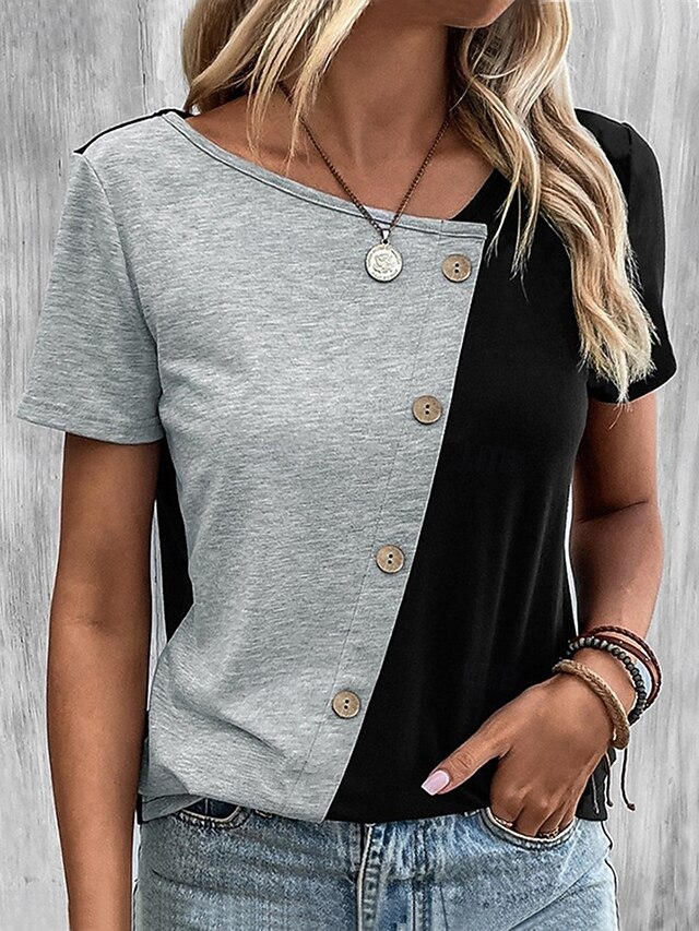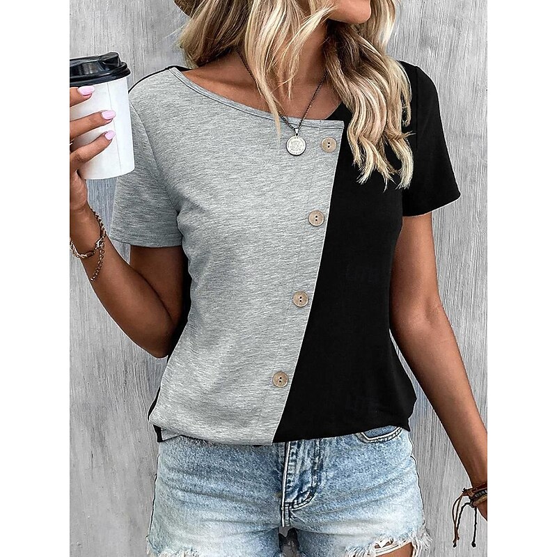 Women's T Shirt Casual Short Sleeve Asymmetric Neck Regular Tops Daily Buttons Black and White Black and gray Summer 2