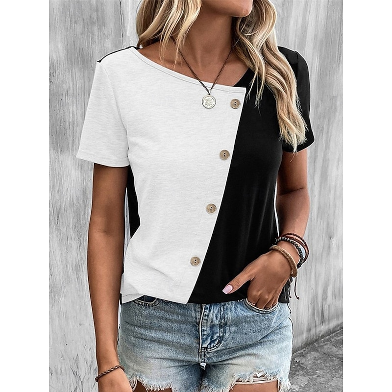 HOT ! Women's T Shirt Casual Short Sleeve Asymmetric Neck Regular Tops Daily Buttons Black and White Black and gray Summer