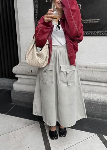 CHARTOU Women Fall Cotton Parachute Skirt Elastic Waisted Cargo Loose Long Skirts with Pockets 7
