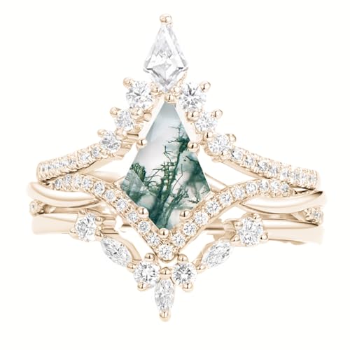 3PCS Natural Moss Agate Wedding Ring Set for Women with Moissanite 1CT Center Kite Cut Natural Moss Agate Ring Set Vintage Engagement Ring Set 925 Sterling Silver 10K 14K 18K Gold 3
