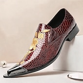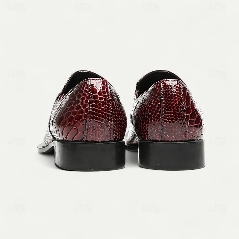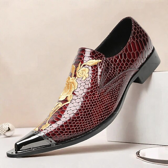 Men's Burgundy Crocodile Pattern Leather Dress Shoes, Luxury Pointed Toe Loafers with Floral Embroidery for Weddings, Parties and Formal Occasions