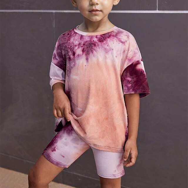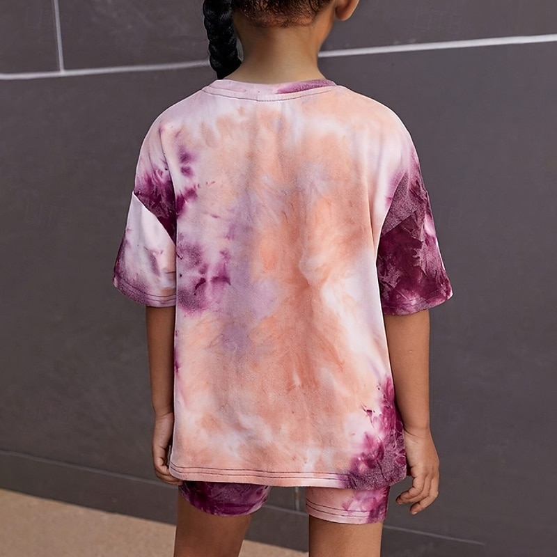 HOT ! 2 Pieces Kids Girls' Tie Dye Crewneck T-shirt & Shorts Set Short Sleeve Fashion Outdoor 4 years+ Summer Purple