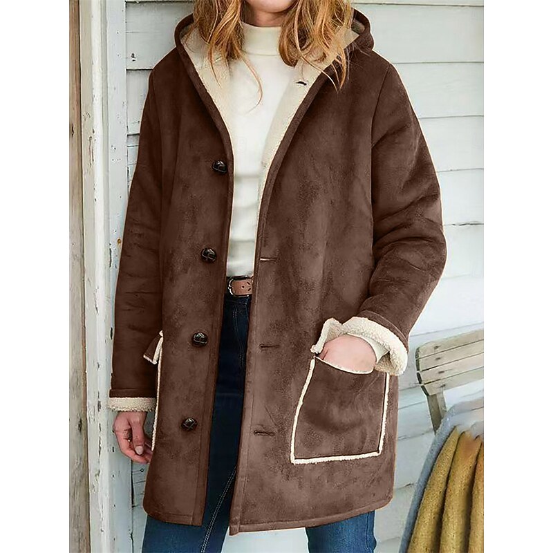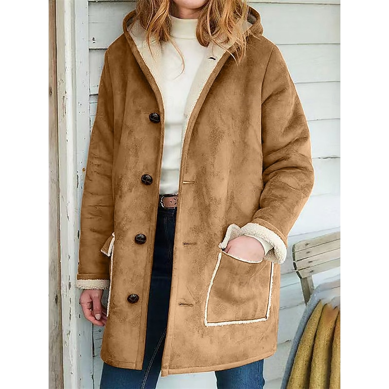 Highlights [Fabric]: Crafted from high-quality polyester, this women's fleece jacket features a plush shearling lining that offers both warmth and a luxurious feel. The faux suede outer layer adds a touch of sophistication, perfect for fall and winter wear. [Fit]: The jacket is designed with a regular fit that ensures comfort and ease of movement, making it a versatile choice for everyday wear. Its long length provides additional coverage, keeping you cozy in cooler temperatures. [Design Highlights]: The fleece jacket includes practical design elements such as a hood for added warmth, large front pockets trimmed with shearling for both style and functionality, and a secure zipper placket. A row of buttons along the front adds a classic touch to the overall look. [Occasions]: This versatile jacket is ideal for various occasions, from daily wear and street outings to vacations and casual gatherings. Whether you're heading out for a relaxed day or a semi-formal event, this jacket complements a range of styles and settings. [Size Range]: Available in sizes S, M, L, XL, and 2XL, providing a suitable fit for a wide range of body types. The jacket's micro-elasticity ensures a comfortable and flattering fit for every wearer.