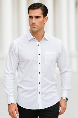 • CLASSIC DESIGN WITH REFINED DETAILS: Featuring a classic point collar and square single-button cuffs, complemented by a left chest pocket and black button front closure, this long sleeve button down shirt exudes understated elegance with exquisite touches. The long sleeves also have a placket button at the sleeve opening for a secure and polished look, effortlessly shining in both formal occasions and daily wear.