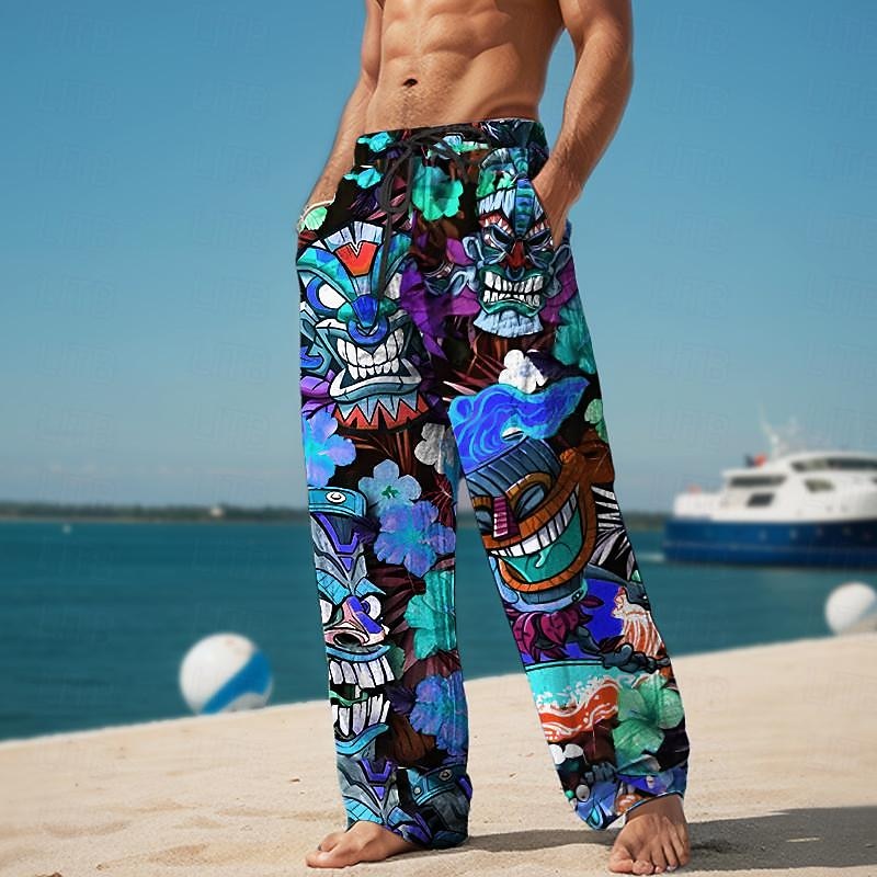 Tiki Tropical Aloha Men's Resort 3D Printed Casual Pants Trousers Elastic Waist Drawstring Loose Fit Straight-Leg Summer Beach Pants S TO 3XL 1