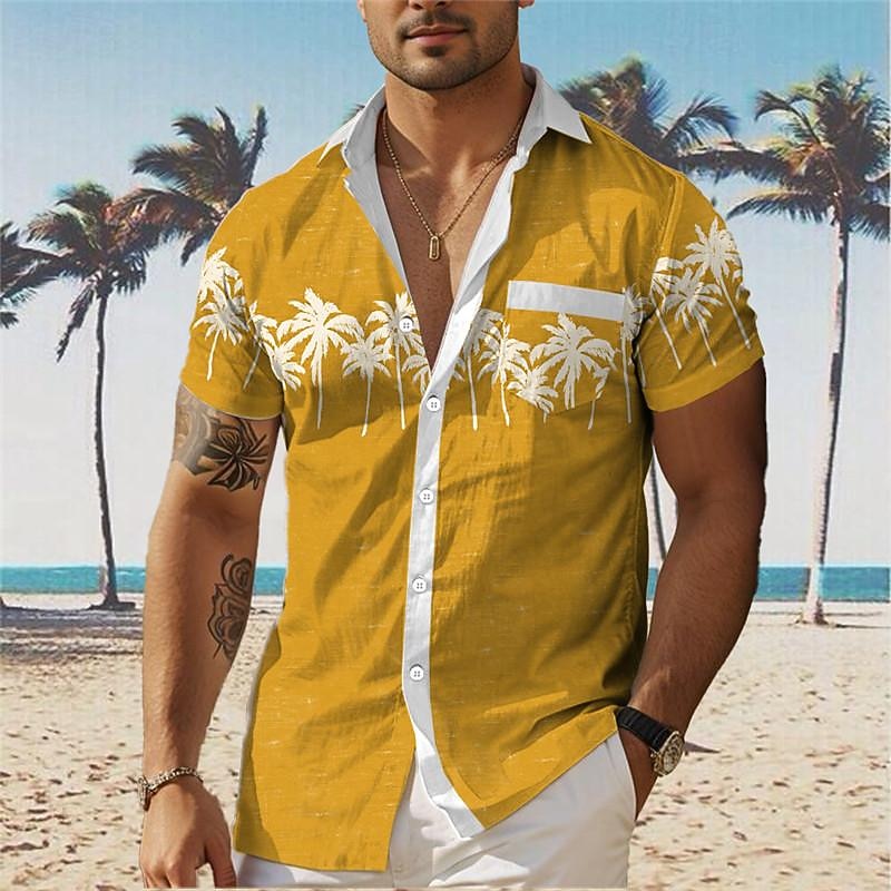 : The shirt showcases a vibrant palm tree and tropical plants print, creating a lively and relaxed vibe. It includes a contrasting turndown collar and button-down front, alongside a practical chest pocket, adding to its trendy appeal.