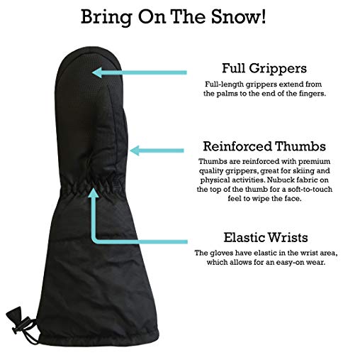 • WATERPROOF, WARM AND SNOW-PROOF: The children’s winter mittens are insulated with 3M Thinsulate insulation for warmth in cold winter temperatures. The mittens are fully waterproof and will keep your kids hands dry in wet, snowy and icy conditions. The toddler gloves also have an elbow length gauntlet cuff with locks that can be tucked over your kid's jacket and coat sleeves to prevent snow from getting inside the gloves.