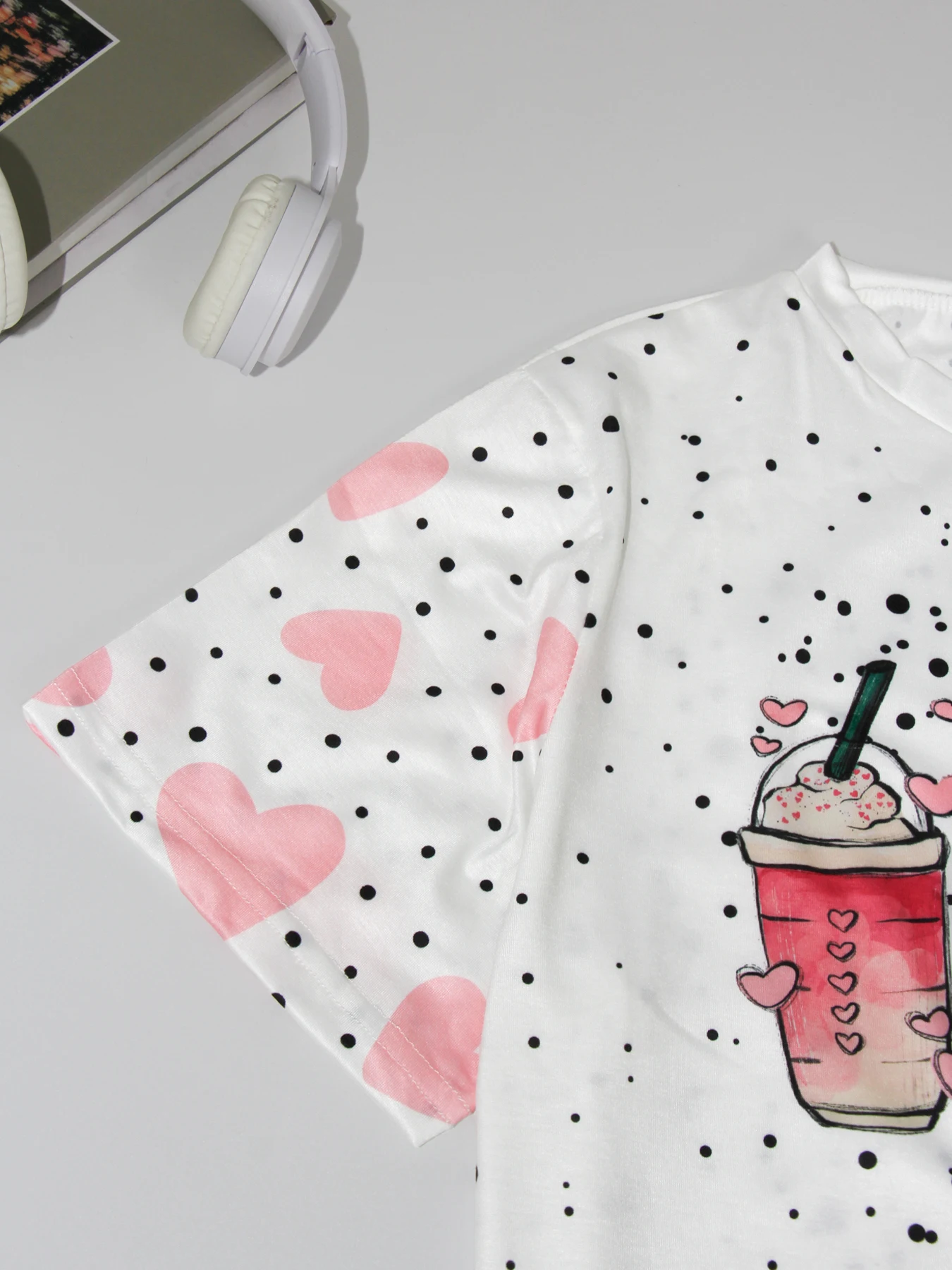 Great Plus size women's stylish coffee cup and love-printed graphic round neck women's T-shirt!