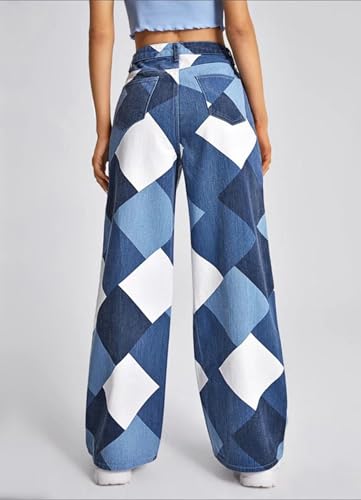 Women's High Waist Straight Wide Leg Jeans Stretchy Baggy Bootcut Geometric Print Boyfriend Denim Pants Y2K 3