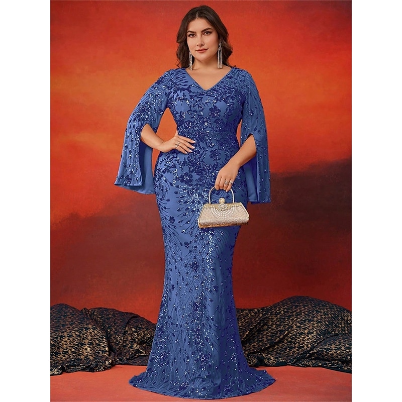 HOT ! Mermaid / Trumpet Plus Size Dresses Elegant Curve Dress Formal Wedding Floor Length Long Sleeve V Neck Sequined with Sequin