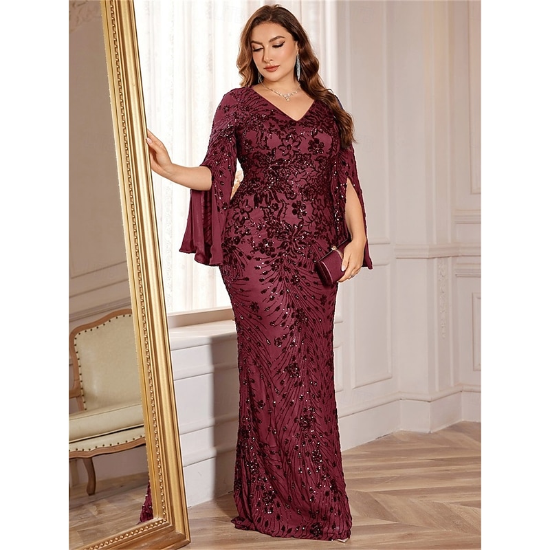 More information about Mermaid / Trumpet Plus Size Dresses Elegant Curve Dress Formal Wedding Floor Length Long Sleeve V Neck Sequined with Sequin