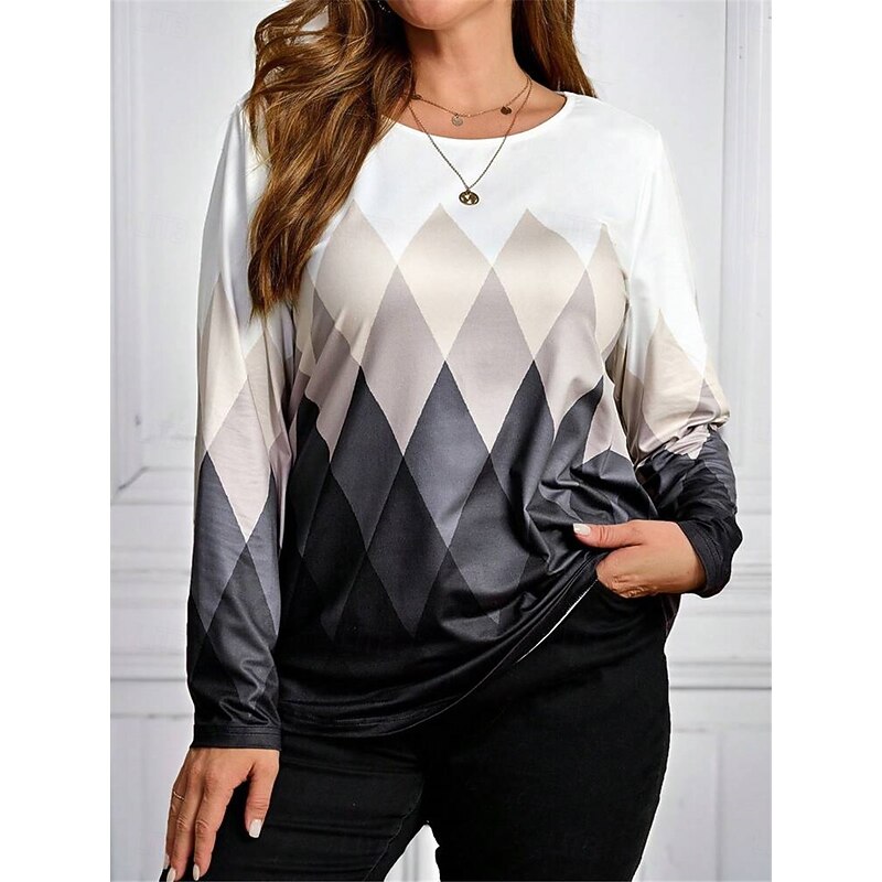 HOT ! Women's Plus Size Tops T shirt Tee Geometry Print Long Sleeve Crew Neck Casual Daily Fall Winter Gray