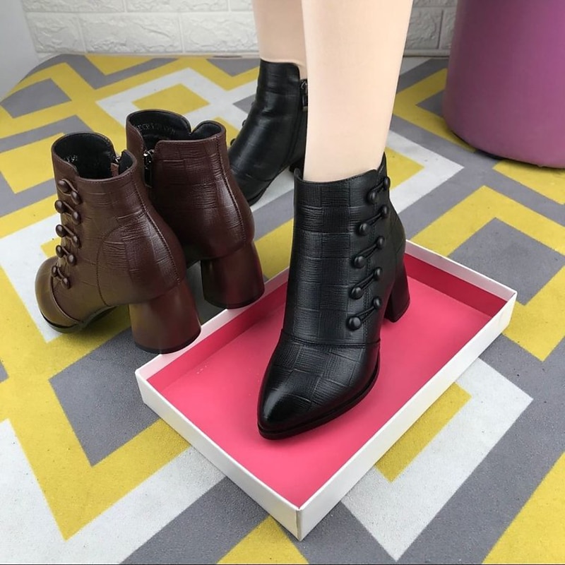 Highlights [Fabric] : Crafted from premium PU, these women's combat boots offer durability and a sophisticated appearance. The textured material provides a luxurious feel, making these booties both stylish and functional for everyday wear. [Silhouette] : Featuring a classic round toe and a chic chunky heel, these ankle boots combine minimalism with elegance. The sturdy block heel not only offers a comfortable fit for all-day wear but also adds a touch of modern sophistication to the design. [Design Highlights] : These boots boast a sleek design embellished with a functional buckle closure. The solid black and coffee color options increase versatility, while the understated buckle detail adds a subtle vintage-inspired touch to the contemporary silhouette. [Occasions] : Perfect for daily wear or outdoor adventures, these boots transition effortlessly from casual to formal settings. Whether you’re attending an outdoor event or going about your daily errands, these versatile booties add a refined flair to any ensemble. [Size Range] : Available in a range of sizes from US5.5 / EU35 to US10.5 / EU42, ensuring a comfortable fit for various foot sizes. Designed to accommodate a broader audience, these boots are a stylish choice for plus-size fashion trends in 2024.