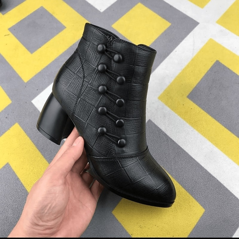 HOT ! Women's Victorian Button Ankle Boots with Textured Plaid Faux Leather – Retro Heeled Booties for Fall Outfits, Office Looks & Tea Party Style