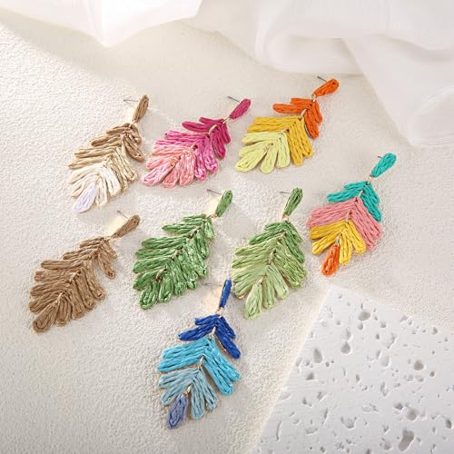 HOT ! Raffia Long Palm Leaf Earrings, Colorful Handmade Rattan Leaf Drop Dangle Earrings Summer Tropical Beach Jewelry
