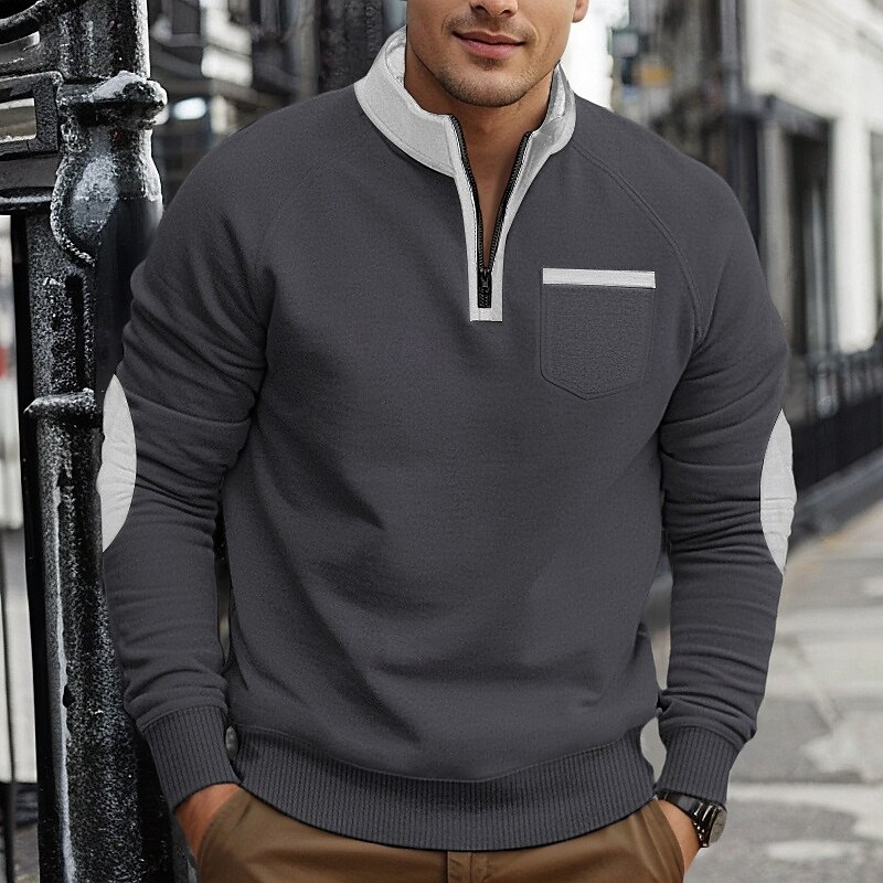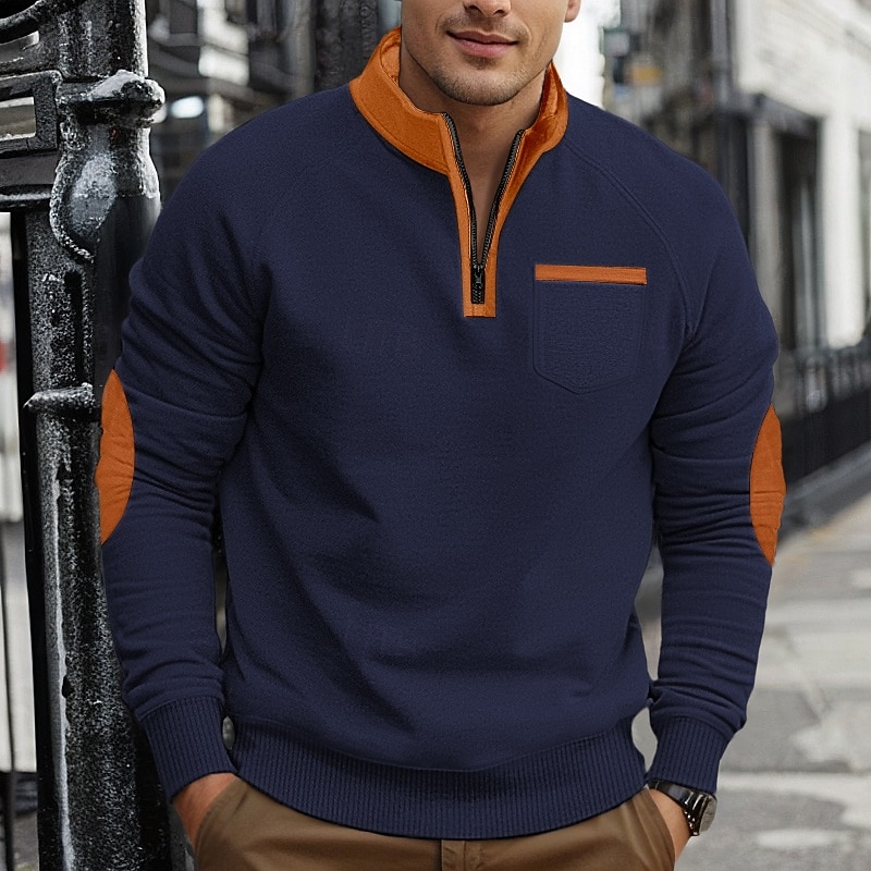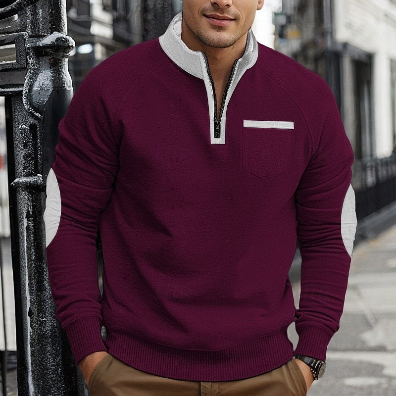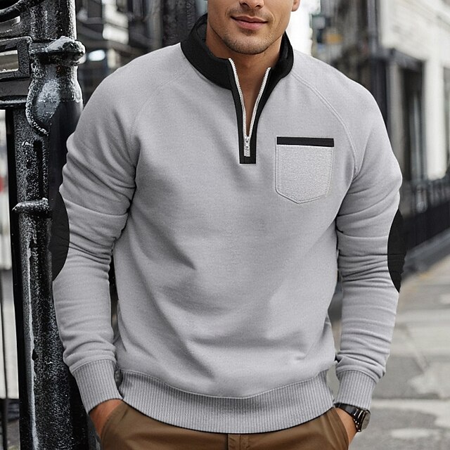 Highlights [Fabric] Made from a high-quality polyester blend, this men’s zip sweatshirt offers a micro-elastic fit for comfort and flexibility. The fabric ensures durability and a soft touch, making it perfect for all-day wear. [Fit] Designed in a regular fit, this sweatshirt contours to the body while allowing ease of movement, ideal for both active and casual settings. The ribbed hem and cuffs provide a snug fit for added warmth and style. [Design Highlights] The sweatshirt features a standing collar with a half-zip closure for adjustable ventilation and easy layering. It includes a distinctive color block pattern with contrasting black details on the collar and a practical chest pocket for functionality. Elbow patches in a darker shade enhance durability and add a modern touch. [Occasions] Suitable for a variety of activities, this pullover is perfect for sports, outdoor adventures, daily wear, casual outings, or relaxed office settings. Its versatile design makes it an essential piece for cross-seasonal wardrobe, particularly in spring and fall. [Size Range] Available in a broad range of sizes from S to 3XL, catering to different body types and preferences.
