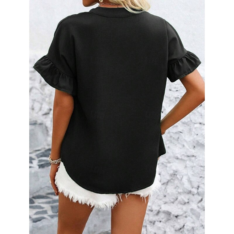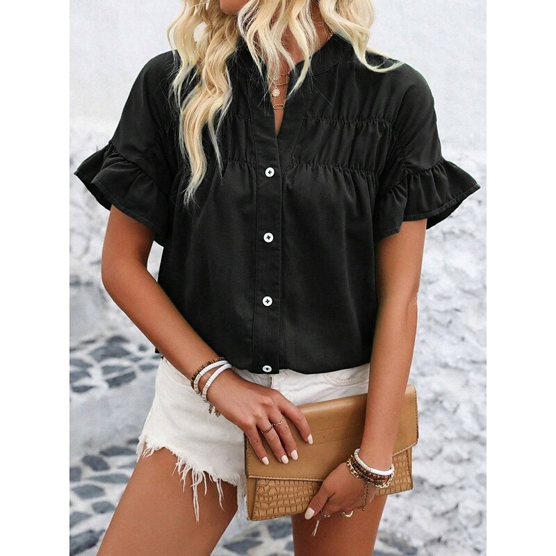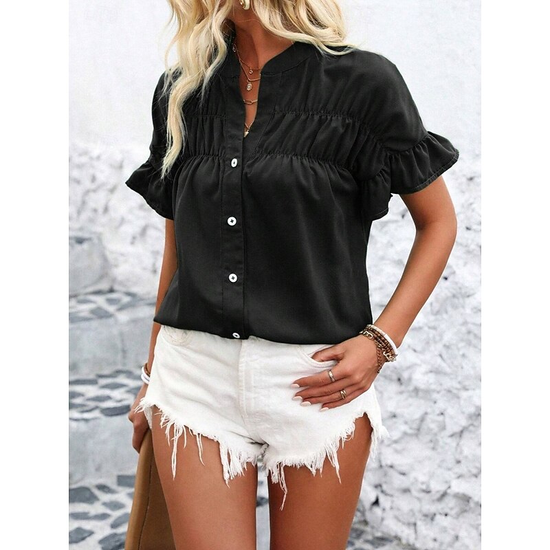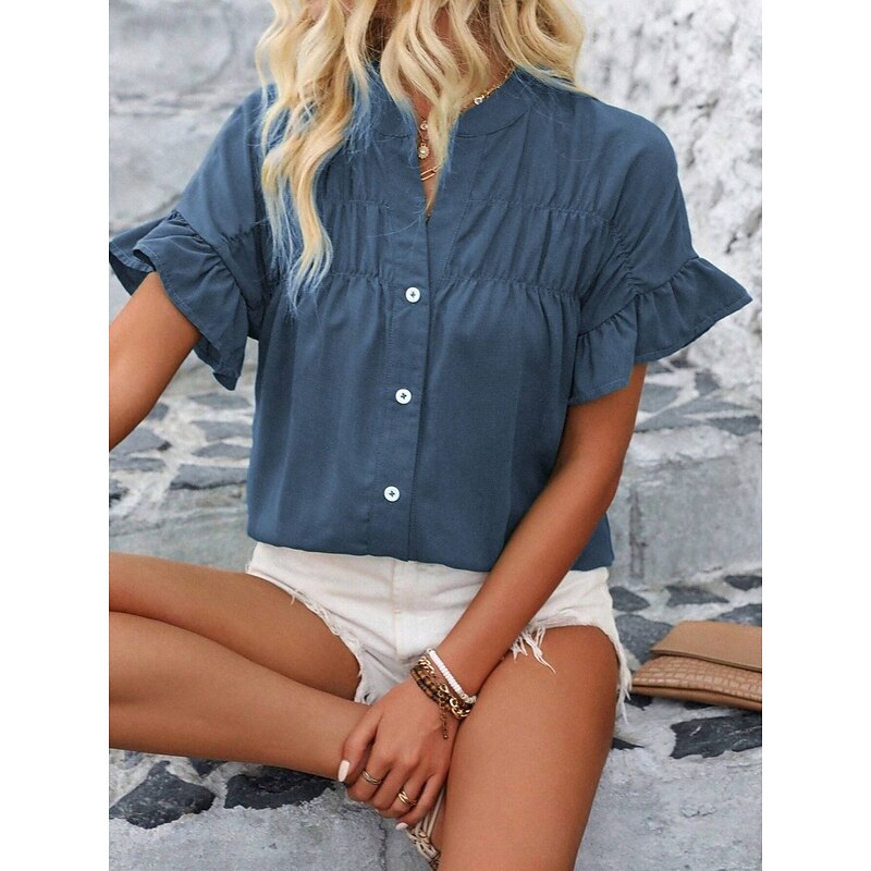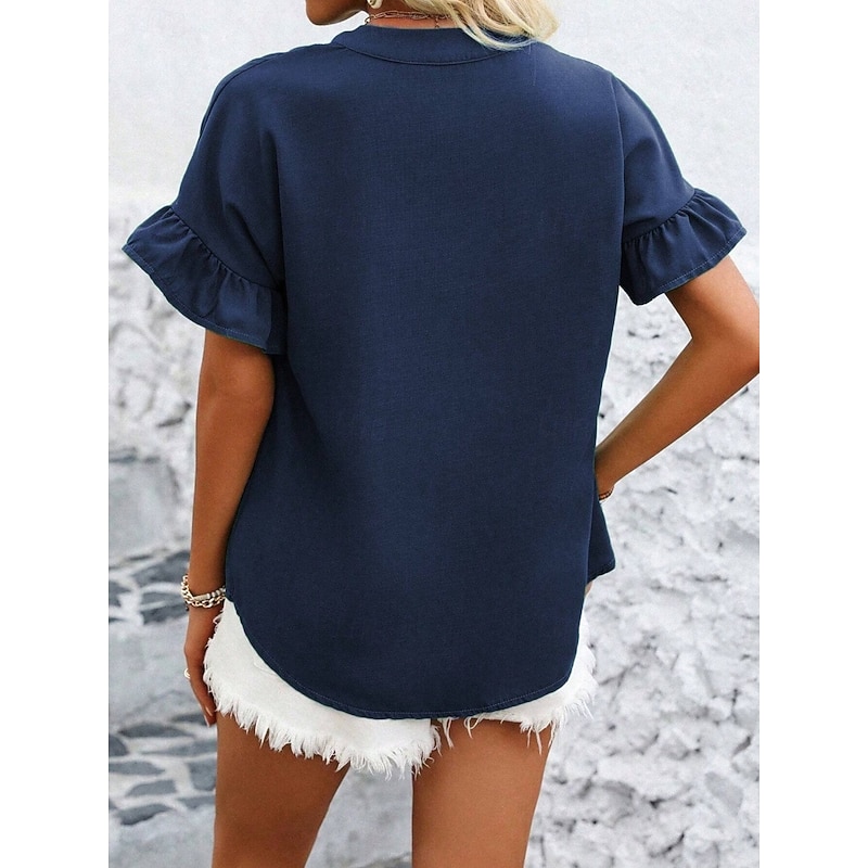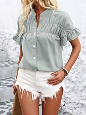 More information about Women's Shirt Blouse Solid Color Stylish Casual Short Sleeve Crew Neck Regular Tops Daily Ruffle Buttons Silver Black Red Navy Blue Blue Summer
