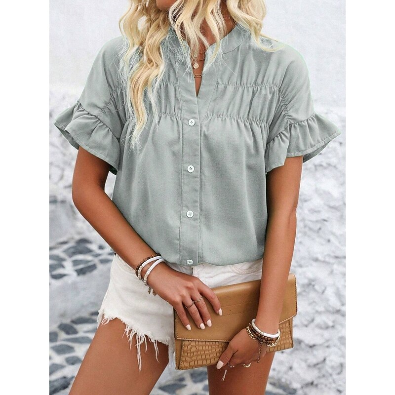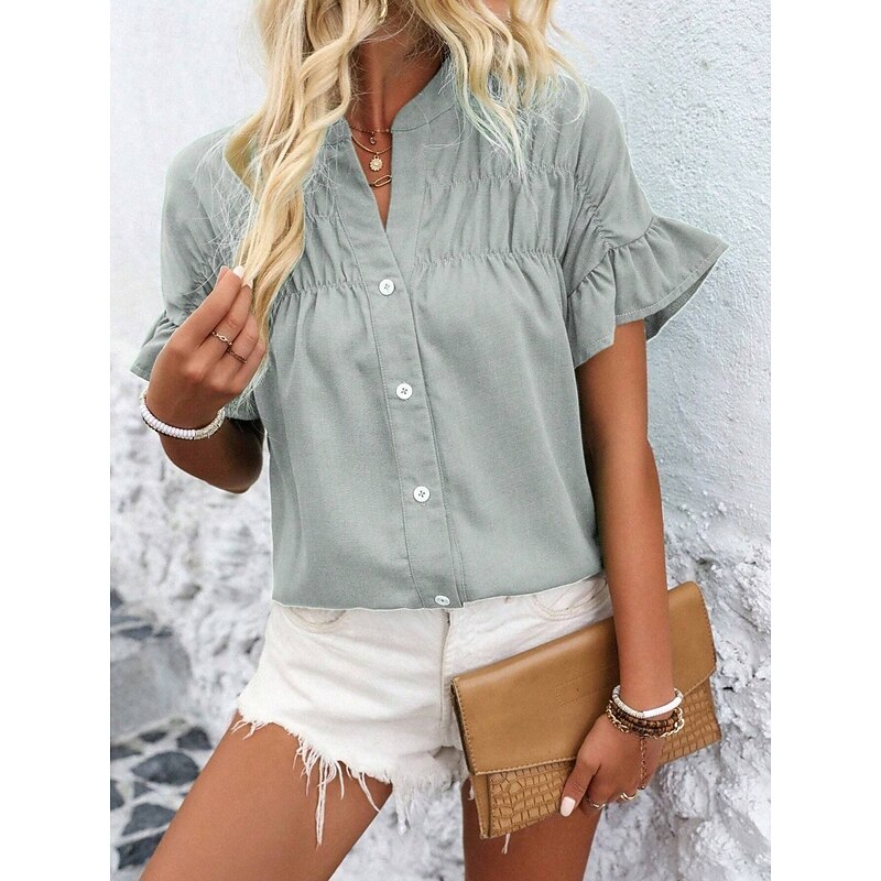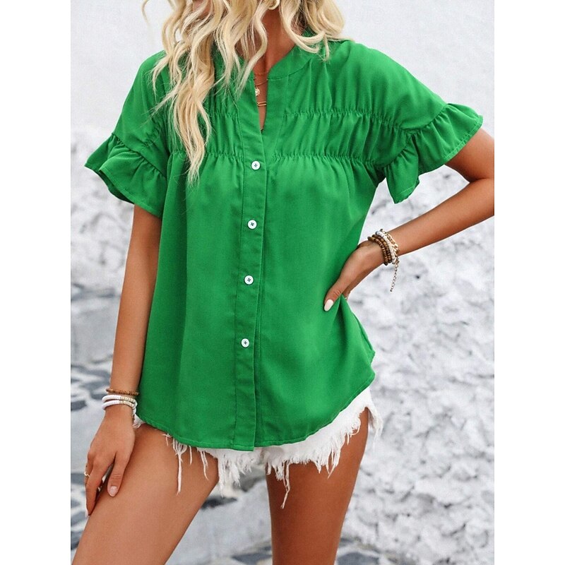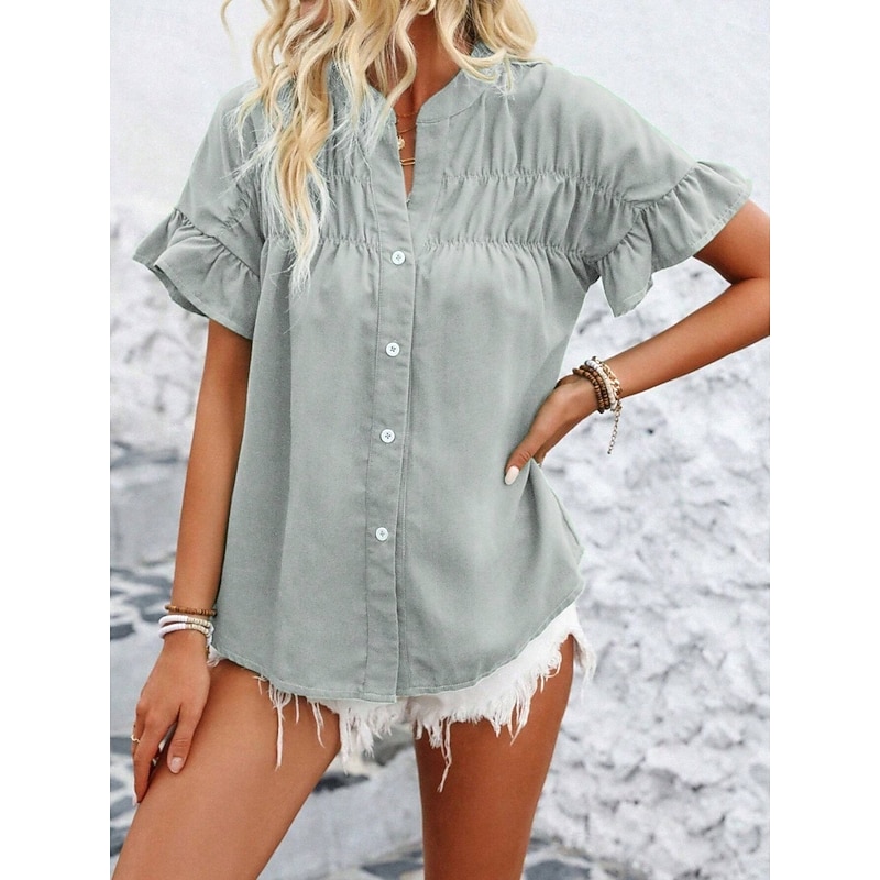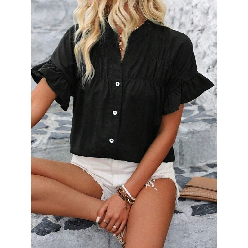 More information about Women's Shirt Blouse Solid Color Stylish Casual Short Sleeve Crew Neck Regular Tops Daily Ruffle Buttons Silver Black Red Navy Blue Blue Summer