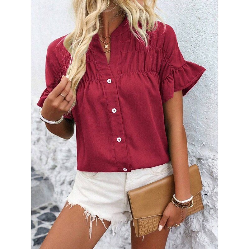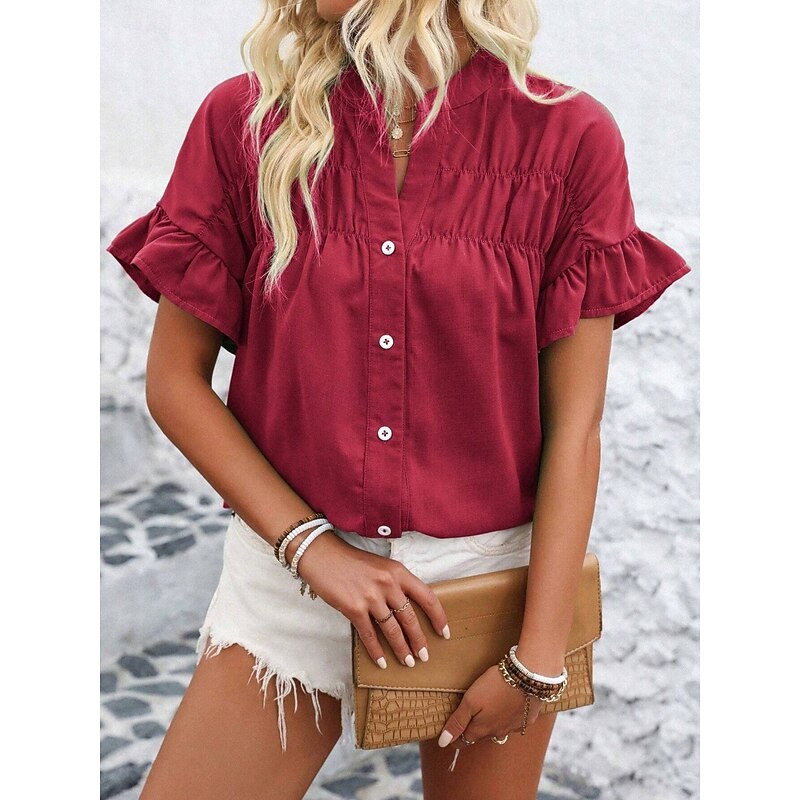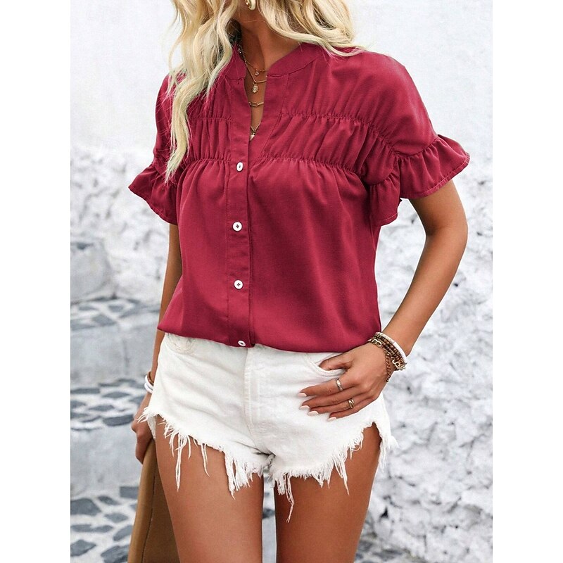 Women's Shirt Blouse Solid Color Stylish Casual Short Sleeve Crew Neck Regular Tops Daily Ruffle Buttons Silver Black Red Navy Blue Blue Summer 42