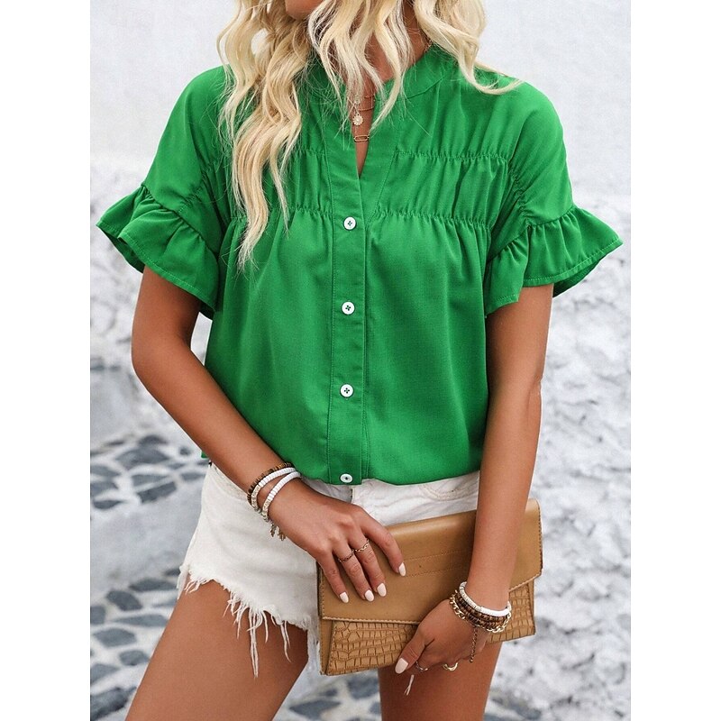 Women's Shirt Blouse Solid Color Stylish Casual Short Sleeve Crew Neck Regular Tops Daily Ruffle Buttons Silver Black Red Navy Blue Blue Summer 22