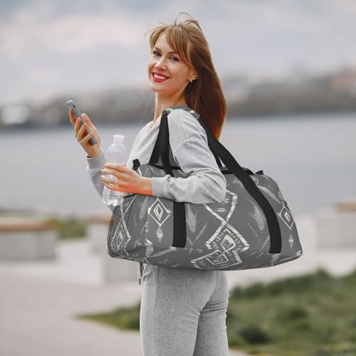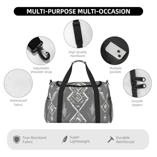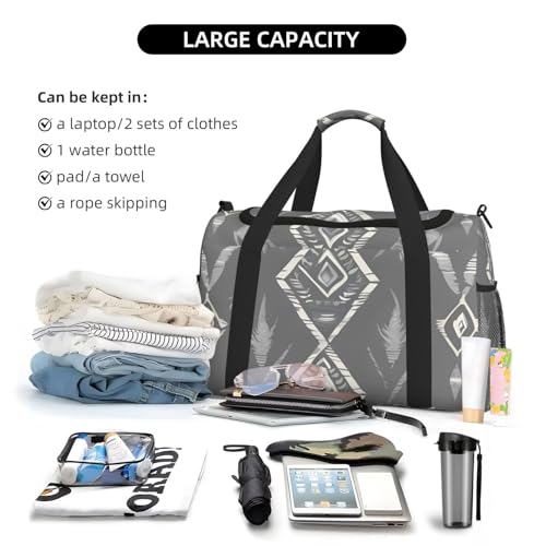 • ThisGrey Tribal Print travel duffle bag measures 50x33x26 cm (19.7x13x10.2 inches), offering ample space to accommodate clothes, electronics, and daily essentials. for weekend getaways, gym workouts, or even as an airplane carry on.