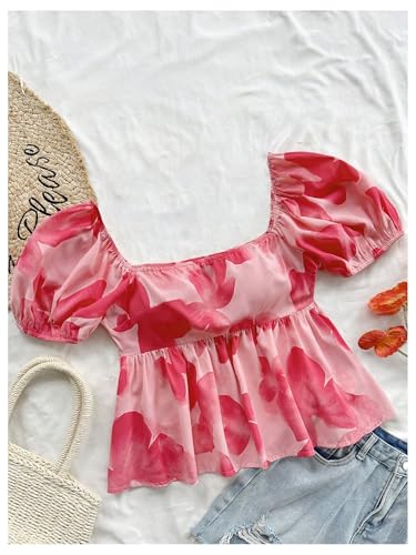 Girl's Floral Print Puff Short Sleeve Blouse Square Neck Boho Ruffle Peplum Shirt Tops 1