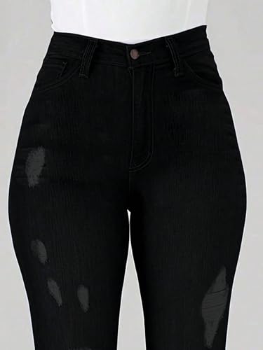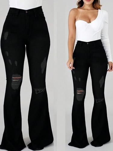 Women's High Waisted Flared Jeans Pull On Ripped Distressed Wide Leg Jeans Stretchy Denim Pants, Bootcut Pants 6