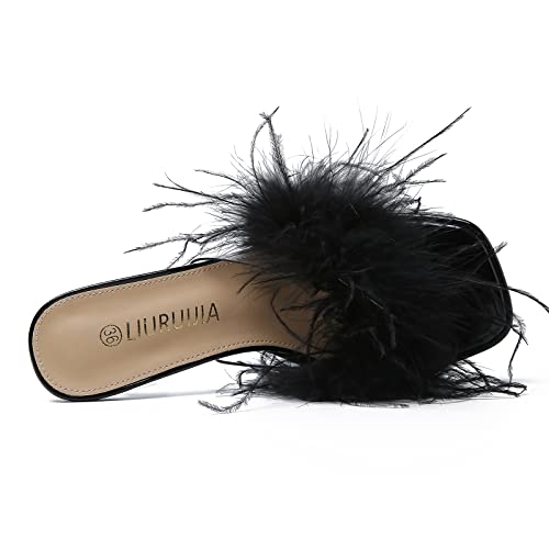 • Fuzzy high heels: Women's fuzzy slippers high heels sandals with a square toe and transparent heel, featuring a fashionable and sexy black fluffy feather design. Our classic high-heeled sandals will definitely add color to the wardrobe of every modern woman and bring you the right height.