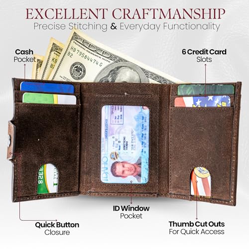 • Durable Crazy Horse Leather: Crafted from high-quality full-grain cowhide, this trifold wallet offers a perfect balance of rugged strength and refined style. Made to last, it will develop a luxurious distressed look and feel as it ages.