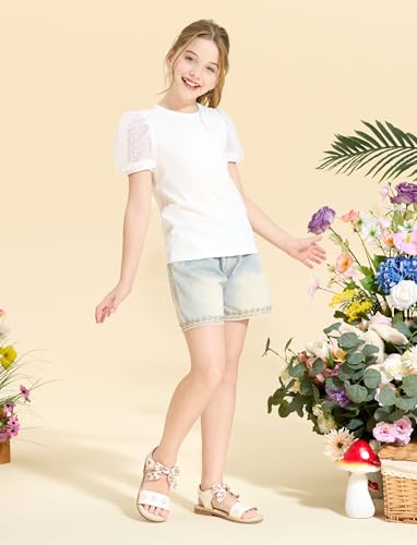 PATPAT Girls Puff Sleeve Shirt Plain Mesh Lace Knit Ribbed Dressy Blouse Summer Tops 2-12 Years 1
