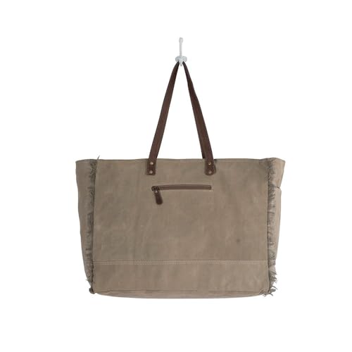 • BEAUTIFUL DETAILS - Woven canvas and upcycled woven rug in gorgeous colors and patterns blend perfectly. Leather accents, frayed edge treatments, and fanciful overprinting complete the unique look. Zipper-close top, canvas back, and carrying straps in matching leather finish out this attractive bag.