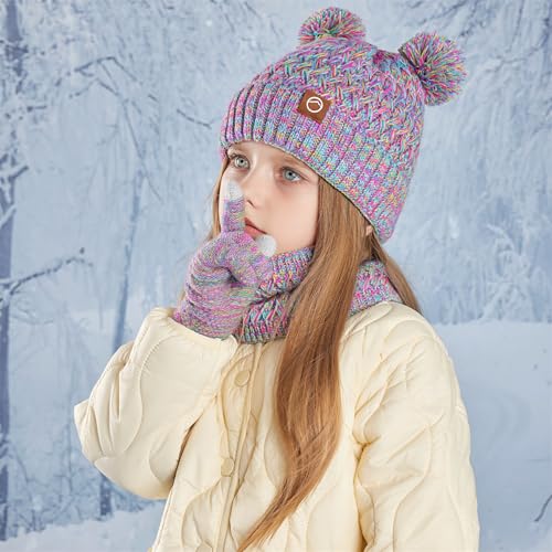 Kids Winter Hat Gloves Scarf Set Beanie with PomPom Fleece Lined Warm Touch Screen for Boys Girls Christmas Gift 5