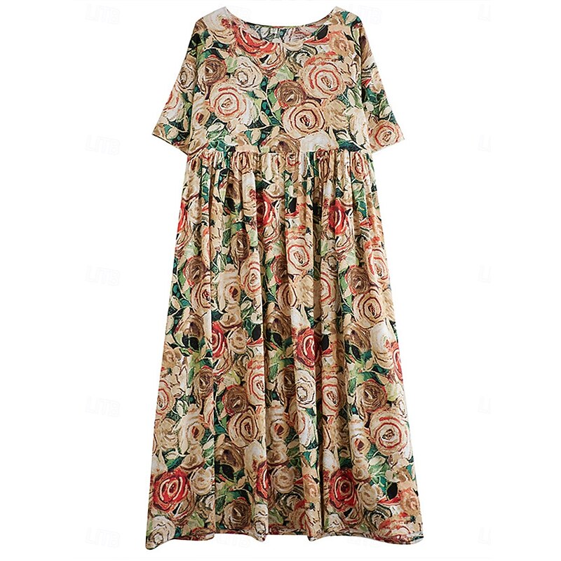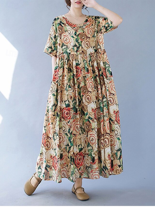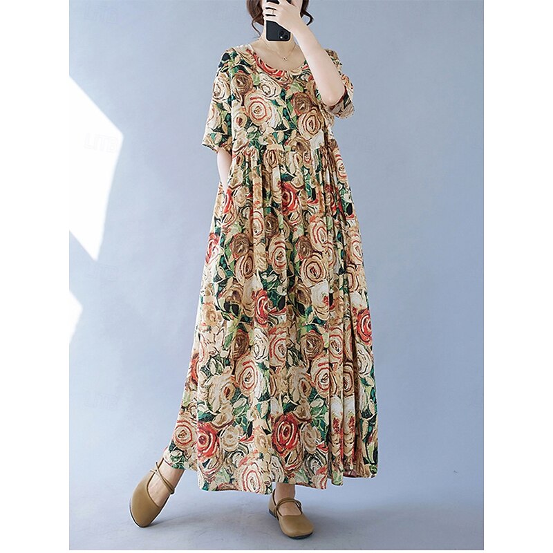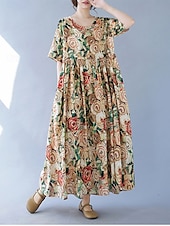 More information about Women's Maxi Dress Cotton Linen Dresses Vintage Dress Swing Dress Cotton Maxi Dress Basic Casual Vacation Daily Regular Fit Floral Short Sleeve Crew Neck Yellow Summer