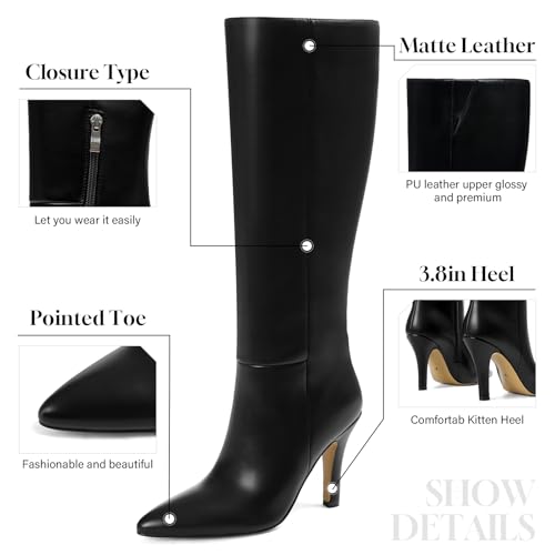 femflame Black Knee High Boots For Women Pointed Toe Stiletto Heel Dress Tall shoes Black Kitten Heel Wide Calf Boots Winter Boot For Women With Zipper 4
