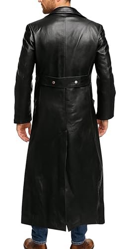 Mens Double Breasted Black Leather Trench Coat - Vintage German Classic Officer Military Uniform Long Jacket 1
