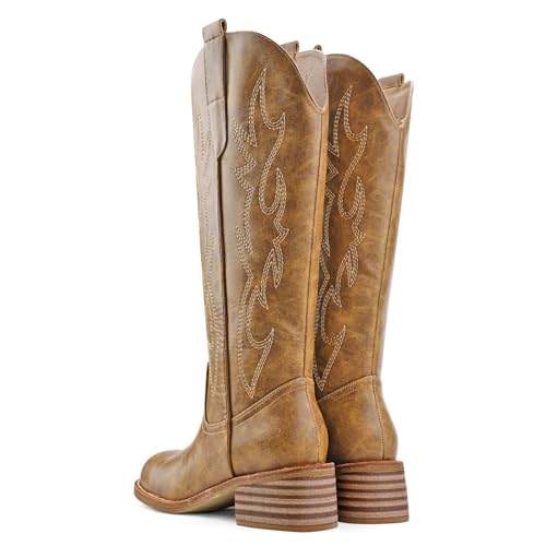 Cowboy Boots Knee High Women Western Embroidered Square Toe Wide Calf Chunky Heel Chunky Heel Retro Classic Tall Boot Pull on for Ladies Fall Winter 4